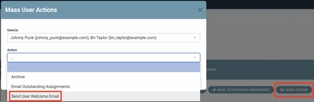 - Mass Action: Under “Users”, click on “Mass Actions”. Then there will be a pop-up where you can select the users you want, select the action as “Send User Welcome Email” and click “Execute Action”.